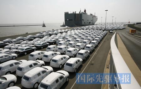 德国实力的秘密在工厂。图为在德国爱登港码头上,一排排崭新的大众汽车等待装船出口海外市场。路透社