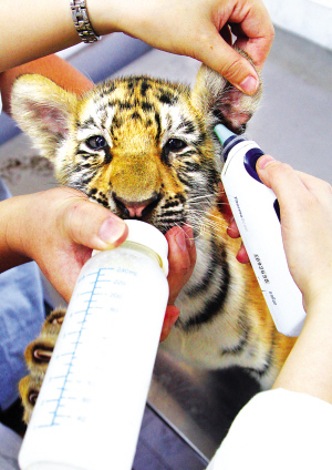 野生动物园里人工饲养的虎宝宝、狮宝宝都是体检的重点对象,几乎每天都要进行相关身体指标的测量。饲养员工作室里,体检工具备了不少,“每天要给虎宝宝量身高、测体重、测体温”,测体温用的是电子体温计,放在虎宝宝的耳朵内,数秒钟就测出了体温。“新生虎仔体温在38摄氏度上下一二分都是正常的,超出这个范围就要请兽医上门做更详细的检查了”。