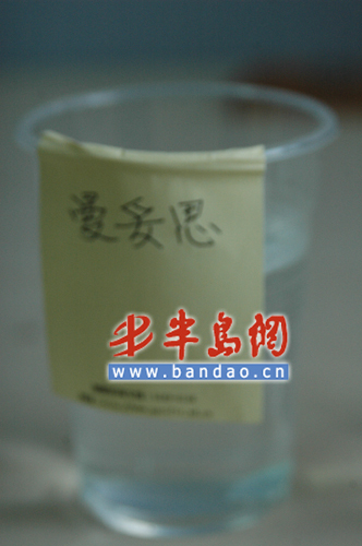 记者分别拿取6个品牌的口香糖颗粒放置于6支水杯中,并在6支水杯里分别注入过半的温水,水温控制在37℃左右,之后观察口香糖颗粒在与温水接触后的不同变化。