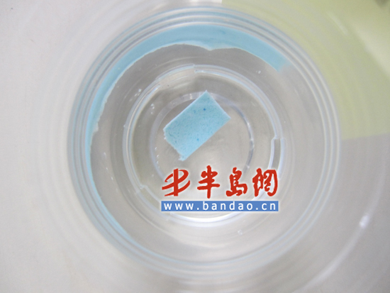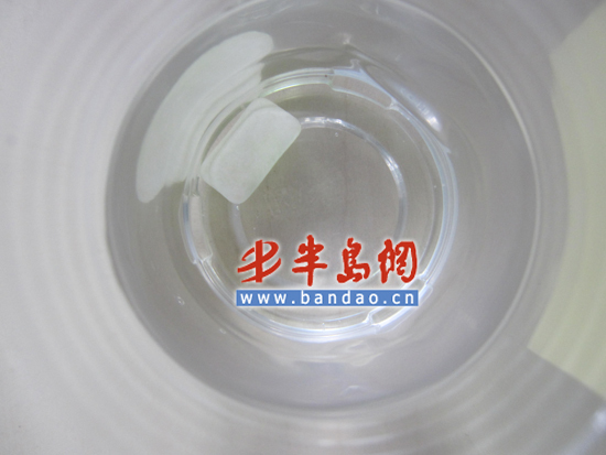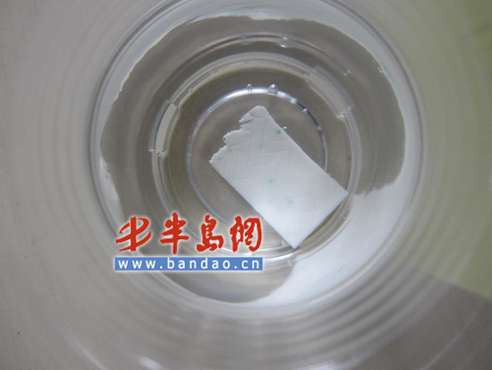 记者看到包衣型口香糖与温水接触不久后,外层的包衣迅速溶解,其中尤以益达、好丽友的包衣溶解速度最快,雅客益牙的溶解速度次之,乐天口香糖的包衣溶解速度最慢,而相对于包衣型口香糖,片装口香糖的表面溶解情况较轻。此外,4支盛有包衣型口香糖的水杯杯底均出现了不同程度的包衣溶解物。