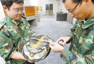 “你又重了。”陈斌拍了拍陆龟的龟壳。虽说岁数比20来岁的陈斌要大不少,这只陆龟还是惊慌地把头及四肢缩进了龟壳下面。陈斌将陆龟翻了个身,开始和同事仔细地查看它身体的各个部位,并且用卷尺测量了其身体的长度和宽度。“别看它平常不动弹,每年可都在‘长身体’啊,我得经常看看它的身体状态”。