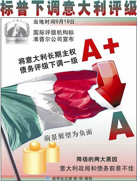其实,意大利的主权债务危机进入评级机构的视野已经有一段时间了,意大利评级被下调并不意外。日前,穆迪公司已经准备下调意大利的主权债务评级,在意大利议会通过政府制定的财政紧缩政策法案后,穆迪公司决定再观察一个月。没想到标普公司捷足先登,宣布将意大利的主权债务降级,而且对其未来前景表示“不乐观”。