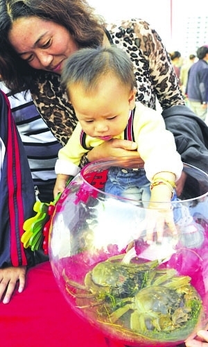 中国洪泽湖大闸蟹节吸引大量游客到洪泽旅游。小客人看到这么大的大闸蟹也忍不住要去抓一只哦!