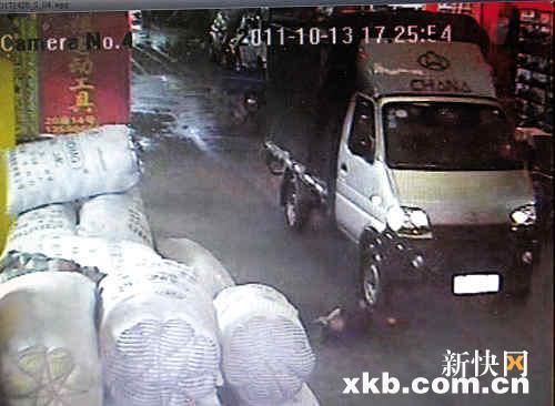 半分钟后,一辆小型货柜车打着右转向灯开来,司机也像没有看到倒在地上的悦悦一样,右侧前后轮两次碾过小悦悦的双腿,其间没有减速。被再次碾压的小悦悦两手朝天,身体在不停抽搐。