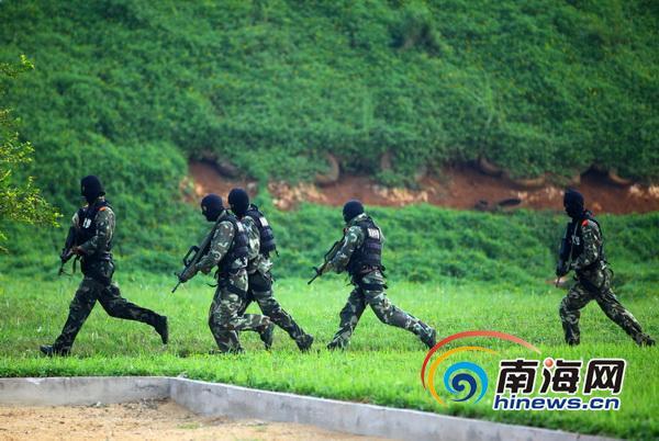 金秋时节,瓜果飘香。海南古老的南渡江畔某山地,满目翠绿在清晨阳光照耀下晶莹闪亮,湛蓝的天空几朵白云飘过。突然,一辆大巴车匆忙驶来,扬起一片尘土,这不是一辆普通的旅游车,车里有被“恐怖分子”劫持的多名游客“人质”!被劫车辆进入伏击地域,随着指挥员一声令下,攻击队员从不同方位同时突入,实施捕歼。瞬间共击毙“恐怖分子”3名、生擒1名,成功解救7名“人质”……精湛的实战演练,赢得了在场领导和专家好评。