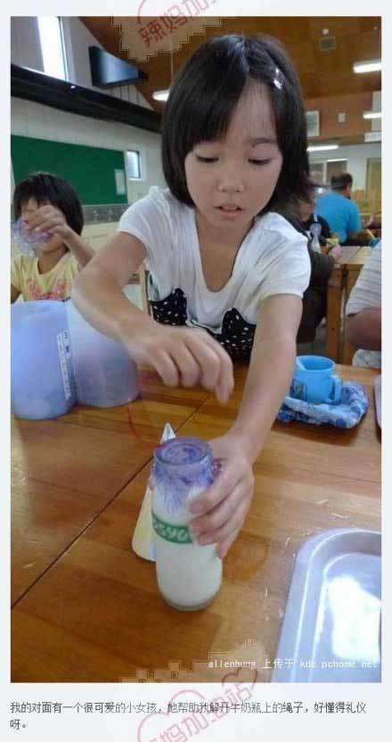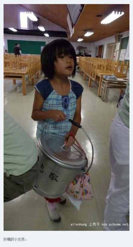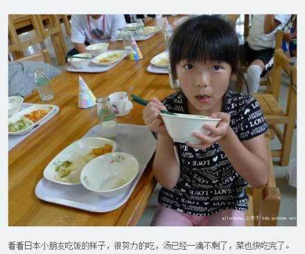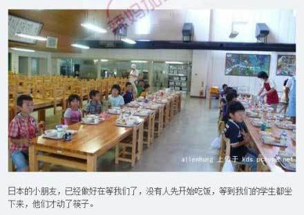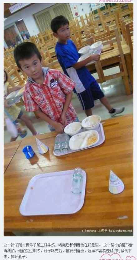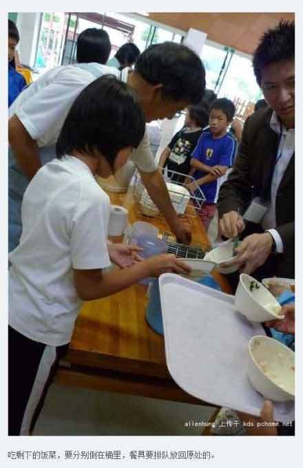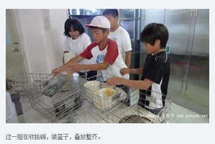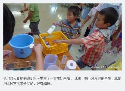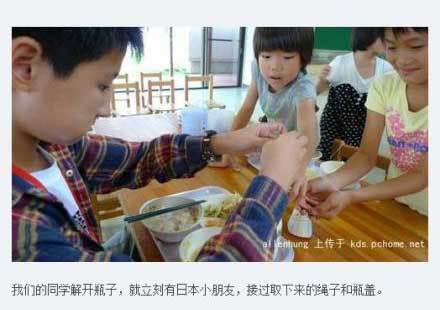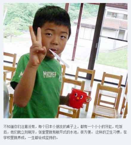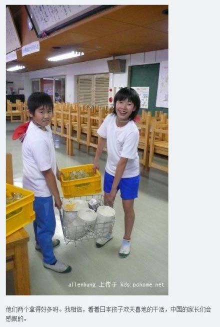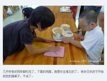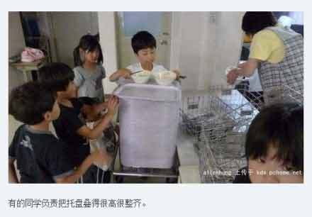不和日本孩子一起吃饭,不知道什么是输在起跑线上。在武石小学的饭堂里,我看见一些孩子穿着白大褂,戴着白口罩白帽子,拿着餐具拎着沉重的牛奶箱迎面而来。她们的个头很小,一看就是低年级的小孩子。他们是帮厨的学生,不管大小学生都要参加。等到我们的学生都坐下来,日本的小朋友才动了筷子。我的对面有一个很可爱的小女孩,她帮助我解开牛奶瓶上的绳子。牛奶喝完,饭菜吃光光,几乎所有日本小朋友的午餐都是这个结果。每个日本小朋友的桌子上,都有一个小小的牙缸,吃饭后,他们就立刻刷牙。下面的场面,就是终生难忘的了。很多日本孩子开始自觉的擦桌子,干活了。没有监工和指挥,各自找能干的活。我相信,看着日本孩子欢天喜地的干活,中国的家长们会感慨的。
