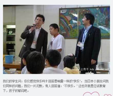 傅颖:其实感觉比较深的,他认为幼儿园开始就是一个孩子离开家庭接触社会,从而树立他基本的一些人格和为人处事的习惯,基本的过程。而当时我还专门问了一个园长说现在很多地方都在说很多的教育法,所有的教育法它的根本实际上是要针对日常生活习惯的教育,另外还有一点比较有意思的就是,在他们那里园长就认为,日本的幼儿园里面他们所负担的只是家庭教育的一个补充,日本的幼儿教育要领当中他将幼儿园教育它已经分为五个方面,第一是健康,第二是人际关系,第三是环境,第四是语言,第五是表现力,日本人其实教育孩子最基本的一点,不能给别人添麻烦,也可以说日本在很长一段时间内是中等阶层占有比较大部分社会比例的这么一个社会,所以它对人今后出人头地也好或者说要高人一等也好,这方面的要求倒变的不是很重要了。那么曾经有一段就是我们也观察到在日本它的大学毕业生,甚至不把作为大公司就业,然后成为一个正规的白领作为他的人生目的,更倾向于拥有一技之长,可以自由的享受、愿意到的生活。