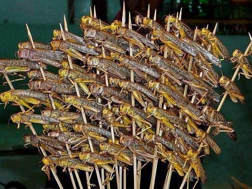 中国的油炸蚂蚱:像炸蚂蚱串这种中国街头小吃通常都会让西方游客驻足停留,瞠目结舌。但是吃昆虫并不像我们想象中的那样不同寻常。联合国粮食农业组织估计全世界约有1400种富含蛋白质的昆虫为人类所享用。