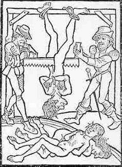 好了,最后的也是最危险的。轮刑仅次于吊笼,在中世纪时期的德国是最常见刑罚形式。首先,受刑者(通常是赤裸的),他的四肢分开绑在地上。不过,木制辐条分别对应各主要关节,如手腕,脚踝,膝盖,臀部和肩膀。行刑者用沉重的包铁的轮子打断四肢和关节。但是,这仅仅是恶梦的开始。等四肢的骨骼分别打碎,和血、肉混成绵软状态后,四肢被编到轮子的辐条上,然后正面朝外悬挂展示。痛苦的受刑者将继续保持该状态数日,他或她死后会变成乌鸦和昆虫的大餐。