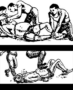 四马分尸是拉架的更高一级刑罚方式,只用于凶杀犯和那些企图杀害贵族或皇室成员的犯人。囚犯的四个手脚分别被捆绑,由四匹马同时向四个方向拉,瞬间即可分尸。(#在中国有五马分尸)