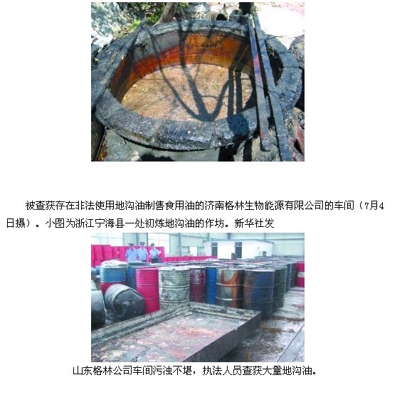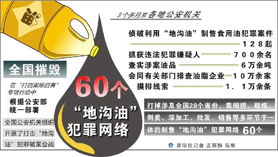 3个多月来,各地侦破利用“地沟油”制售食用油犯罪案件128起,抓获违法犯罪嫌疑人700余名,查实涉案油品6万余吨;打掉涉及全国28个省份,集掏捞、粗炼、倒卖、深加工、批发、销售等多环节于一体的制售“地沟油”犯罪网络60个。 图片来源:新华网