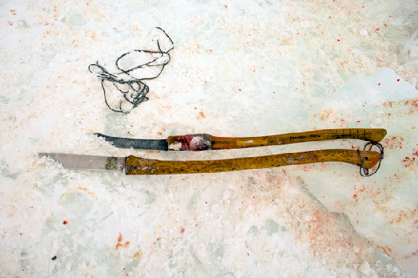 阿拉斯加西北地区、亚洲沿海地区和格陵兰岛的爱斯基摩人捕鲸队一般由6个划桨手,1个舵手,1个投叉手组成。传统的捕鲸方法是众人手持捕鲸鱼叉竭力投向猎物,把受伤的鲸拖得精疲力尽,使它浮出水面。这样猎人有足够的时间使用梭镖杀死它。