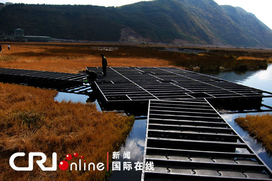 为了方便游客体验湿地的美景,保护区管理处正在建设这种能够漂浮在书面上的栈道,当游客行走在这样的新型栈道上时,更像悬浮在水面上一样。尹牧摄