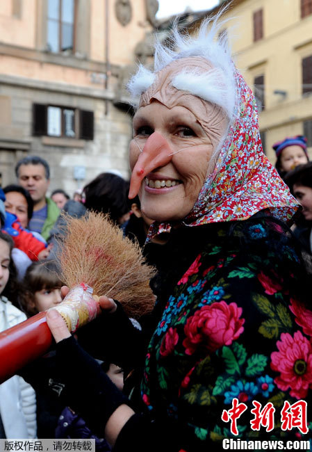 当地时间1月5日,意大利各地举行一年一度的主显节游行。图为游行中一个女巫打扮的人给孩子们分发礼物。