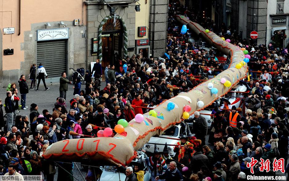 当地时间1月5日,意大利各地举行一年一度的主显节游行。图为女巫打扮的女人们抬着装满礼物和糖果的52米的长袜在游行队伍中。