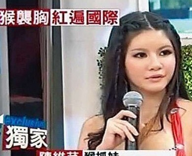 22岁的台湾嫩模陈维芊,去年9月在峇里的猴子森林内,意外被一只猴子扯掉上衣,两点几乎走光,这张照片随即在网络疯传。虽然一“抓”成名,但她为了延续声势,继续冒险。上月她在台南就接受脂肪移植手术,把臀部肥脂转移到胸部,将32B微波隆到32E大胸。