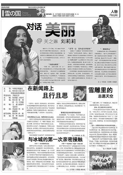 本次雪雕大赛不仅吸引了各高校专业人士的积极参与,更获得了社会各界的广泛关注。在卫康公益的支持下,中国青年报社、中国高校传媒联盟选拔了来自全国34所学校的50名校媒记者全程报道本次活动,借雪雕大赛展开了一场新闻实战训练营。在中青报冰点周刊主编徐百柯的新闻业务培训后,各校媒记者分赴大赛各个角落,他们通过微博、人人网等自媒体平台对本次大赛进行了广泛传播,并制作出一期雪雕大赛特刊。