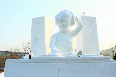 他们的参赛作品叫做“DJ baby”。Karl一边向我们介绍正在雕刻的细节,一边展示着作品的完成效果图。画中是一个只穿着纸尿裤的婴儿戴着专业的耳机操控音响台。虽然是一副婴儿模样,却难掩身上成人般的成熟气质和DJ的那份专业与摩登。在Karl他们看来,婴儿虽然在生理与心理上都被贴上了不成熟的标签,但早已在很多方面显现出一些成年人所拥有的特点与气质。这是Karl第一次来中国的哈尔滨。对他而言,除了兴奋,更多的是珍惜这个年轻人之间相互交流的机会。来哈尔滨前,他和他的团队还参加了在莫斯科举办的另一个非常著名的雪雕大赛。在那里他们收获了赞扬和友谊,他们此次来哈尔滨也期待可以收获更多的精彩。这不仅仅是一次国际大学生之间的雪雕比赛,而是一场青春的赛跑,他们称之为“Racing of Youth”。
