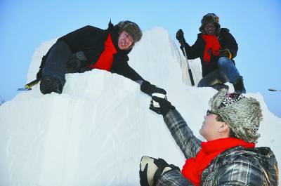 冰雪中的微笑——英国诺丁汉特伦特大学参赛选手钻到雪块中作业