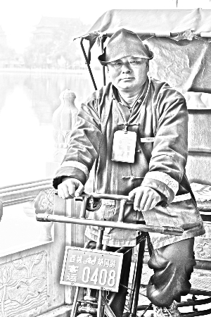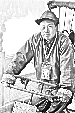 每天早晨九点整,什刹海旅游咨询站门前都会有“亮相”仪式。八位中年汉子身穿咖啡色对襟上衣、黑色灯笼裤、脚蹬千层底黑布鞋,人手一把绸掸子。他们拿着掸子先在小腿和前臂上各掸一下,接着在身后的三轮车上铺毯、掸车、擦喇叭,最后还要来几句京剧唱腔。