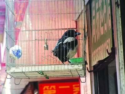 喜鹊是国家三级保护动物,不允许个人非法猎捕饲养。然而,记者近日接到市民报料称,在南京天妃巷,一家小店挂出一只鸟笼,里面养的喜鹊双翅羽毛被剪掉,尾巴也秃秃的,让人觉得十分不忍。有市民劝店主,尽早把喜鹊放归大自然吧。武家敏 梅建明 摄