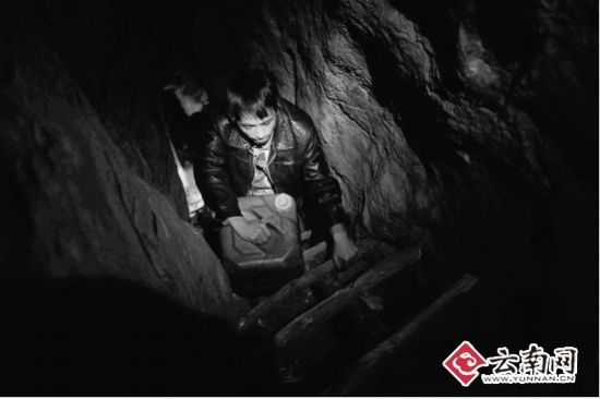 从山石的狭缝中挤进洞穴后,外面的光线已经照不进来,我以为离水源已经不远,可村民告诉我们才走了1/3。借助手电筒的光照和用松树杈制作的简易“楼梯”我们才得以继续深入。相机的感光度已经调到了极限,仍然难以捕捉到清晰的影像,不过之前担心的缺氧问题倒是没有出现,有人开玩笑说要是现在地震,我们怕是上不去了……大约走了10多分钟,深入地心90米,终于见到那汪清澈的泉水,用手一摸,还略带温热。村民们七手八脚地将水装入桶中,或背或扛,又花了10多分钟才把水从山洞中运出……这是我做记者以来一段难忘的经历。本报记者 周明佳 摄