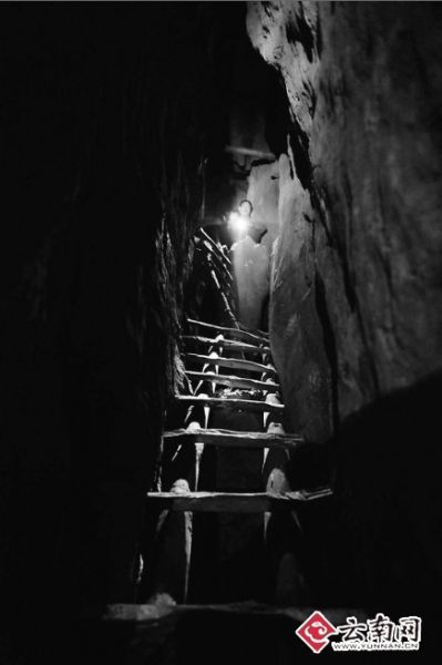 为了方便背水,村民在洞穴中搭起简易梯子。