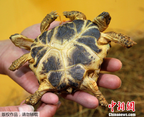 2012年3月5日,在乌克兰基辅的国家历史博物馆里,工作人员展示一只双头乌龟,这只乌龟的品种为四爪陆龟。