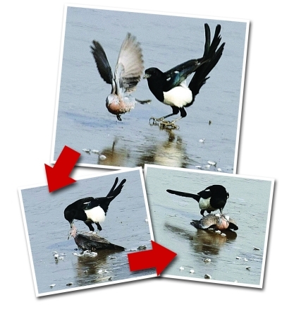 而最凶猛的一只喜鹊立在中间,用爪子摁住斑鸠,用坚硬的喙不断地啄着挣扎并哀鸣的斑鸠。搏斗中,斑鸠企图逃跑,被随即赶到的喜鹊摁住,狠啄了一通。直到将斑鸠杀死,喜鹊才将斑鸠身上的羽毛一根根拔下,再一口一口地吃掉斑鸠,旁边还有数十只喜鹊围观,时不时上来啄上几口占点小便宜。