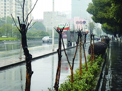 接到线索后,昨天下午1点钟左右,记者来到龙蟠中路,在龙蟠中路东侧,通济门公交车站附近,找到了市民所说的紫薇树。只见这些紫薇树都已经被剪得只剩下高约1米,粗约3厘米的树干,树干顶端仅有几根几厘米长的树枝。紫薇树树干部分整体上光溜溜一片,夹杂有很多黑色的霉斑点。记者前后看了一下,发现从该路口到体育公园长约100米的绿化带中,所有的紫薇树都出现了这种情况,总共有100棵左右。