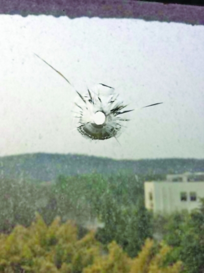 被射穿的玻璃上弹孔很规则。裴睿 摄
