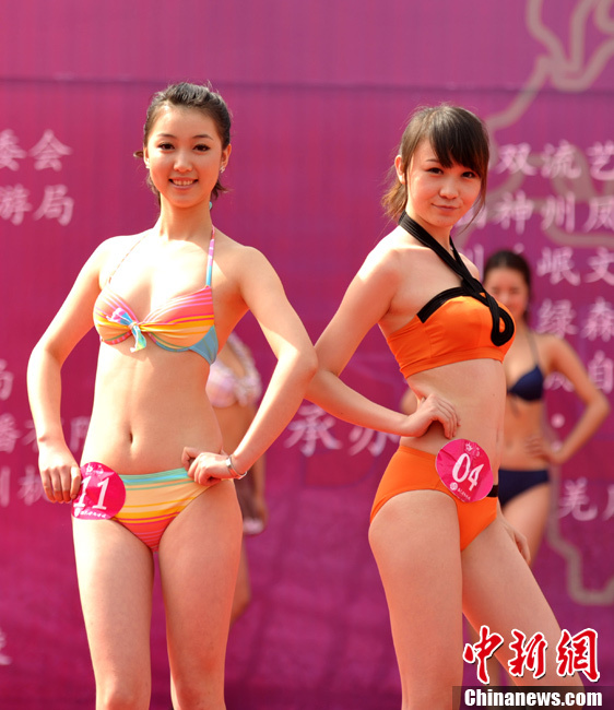 3月24日,国际旅游小姐四川区总决赛在绵阳市举行,来自四川茂县的羌族选手杨佳丽获得冠军、成都选手李馥君获得亚军、四川绵阳的郭亚楠获得季军,四川汶川的朱丽获得羌族金花。比赛现场参赛选手正在进行泳装展示。刘忠俊 摄