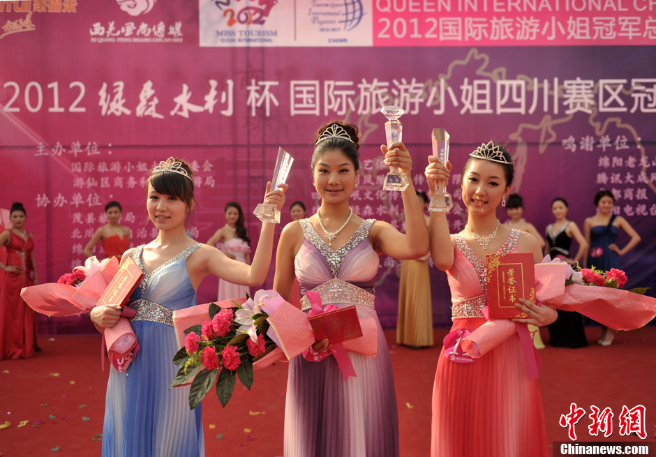 3月24日,国际旅游小姐四川区总决赛在绵阳市举行,来自四川茂县的羌族选手杨佳丽获得冠军、成都选手李馥君获得亚军、四川绵阳的郭亚楠获得季军,四川汶川的朱丽获得羌族金花。据悉,获奖选手将在4月参加中国区总决赛。图为来自地震灾区茂县的羌族姑娘杨佳丽获得四川区冠军(中)。刘忠俊 摄