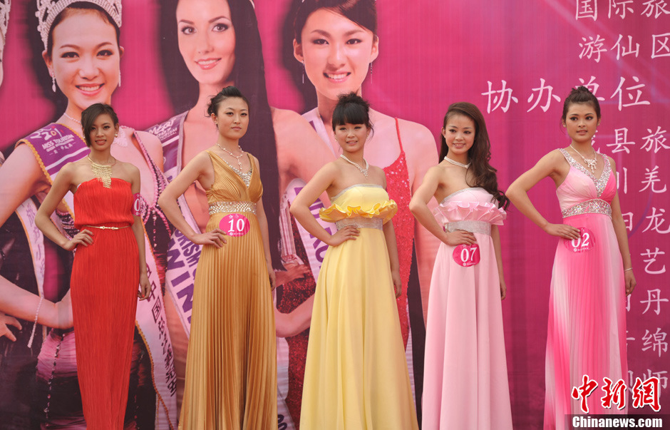 3月24日,国际旅游小姐四川区总决赛在绵阳市举行,来自四川茂县的羌族选手杨佳丽获得冠军、成都选手李馥君获得亚军、四川绵阳的郭亚楠获得季军,四川汶川的朱丽获得羌族金花。图为参赛选手正在比赛。刘忠俊 摄