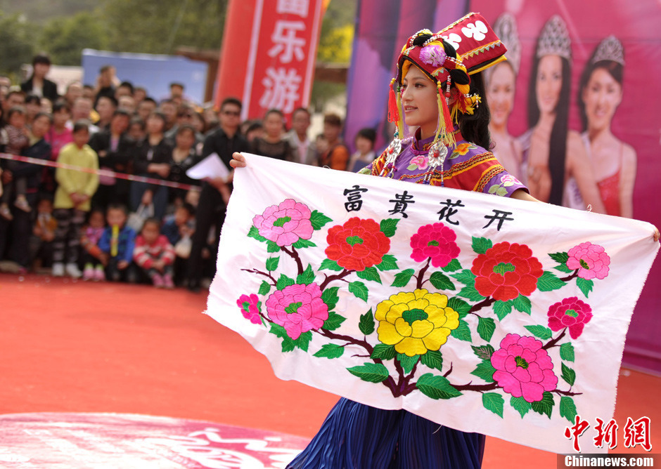 3月24日,国际旅游小姐四川区总决赛在绵阳市举行,来自四川茂县的羌族选手杨佳丽获得冠军、成都选手李馥君获得亚军、四川绵阳的郭亚楠获得季军,四川汶川的朱丽获得羌族金花。图为参赛的羌族选手正在进行才艺展示。 刘忠俊 摄