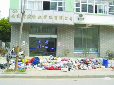 记者来到只隔一条马路的天和苑物管公司南京辉燕物业管理有限公司,只见门前堆着一大堆垃圾,一些路过的行人掩鼻而过,唯恐避之不及。