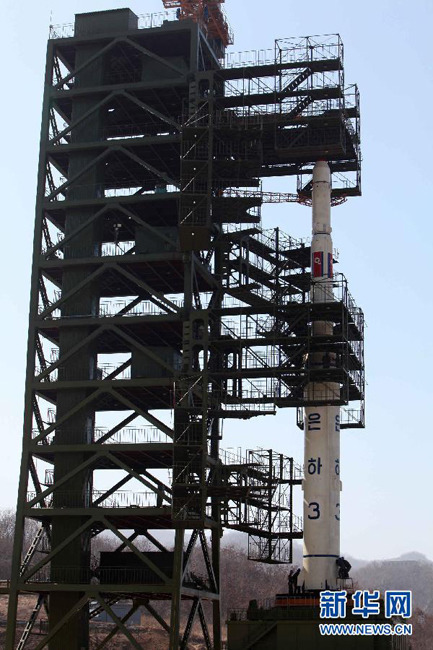 这是4月8日在朝鲜平安北道铁山郡东昌里的“西海卫星发射场”拍摄的已经基本安装完成的“银河3号”运载火箭。朝鲜当日安排外国记者到位于平安北道铁山郡东昌里的“西海卫星发射场”参观卫星发射综合指挥所和“光明星3号”卫星发射塔。新华社记者张利摄 图片来源:新华网