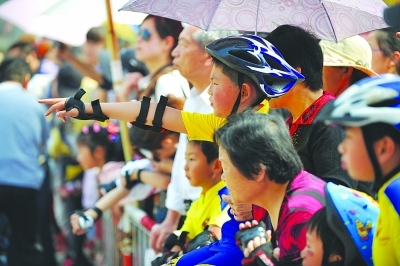 比赛时,选手在场内奋力拼搏,场外的家长也不闲着。“宝贝,哨子一响,你就使劲往前滑啊!妈妈给你加油。”今年4岁半的刘若妍正在起跑线上蓄势待发,妈妈拿着相机在边上给她打气:“你不要看妈妈,要看前面,妈妈在前面等着你啊。”