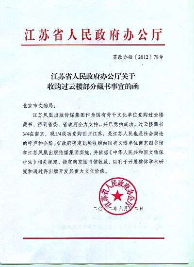 江苏迅即应对,省人民政府办公厅昨日紧急向北京市文物局发出《关于收购过云楼部分藏书事宜的函》,函中写道:江苏凤凰出版传媒集团作为国有骨干文化单位竞购过云楼藏书,得到省委、省政府全力支持,并已竞拍成功。过云楼藏书3/4在南京,现1/4成功竞购回归江苏,是江苏人民也是社会舆论的呼声和企盼。省政府确定此项收购由国有文博单位南京图书馆和江苏凤凰出版传媒集团实施,并依据《中华人民共和国文物保护法》相关规定,指定南京图书馆收藏,以利于开展整体学术研究和通过再出版开发其重大文化价值。