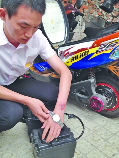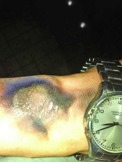 “在下楼梯的时候,电瓶的插头碰到了我手上的手表,当时手表就爆了。我感觉像触电一样。”王先生说,这两块电动车蓄电池由一根充电线相连,在下楼时,充电线上的金属插头晃动中碰到他手上的“汉密尔顿”牌金属手表,王先生当时感觉像触电,价值4500多元的手表被“炸”坏,而紧贴手表位置的手腕皮肤也在瞬间被烫伤,留下一个非常明显的表盘形状的伤痕。