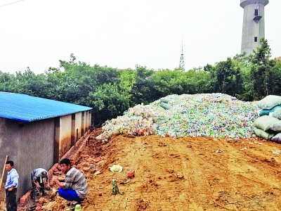 大图:黑作坊院子后面废旧塑料瓶堆积如山。