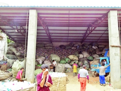 小图:黑作坊内废旧塑料瓶也堆积成山。
