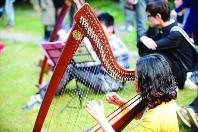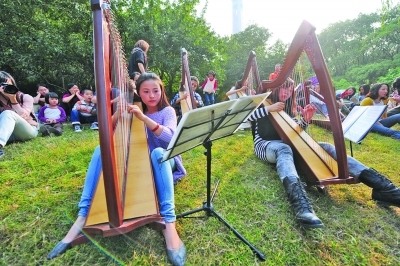 小湖边的草地上,一袭白衣的姑娘轻抚竖琴,弹奏出清雅的音乐,这样一幅美如画卷的景象昨日在古林公园内上演。数十位竖琴爱好者齐聚这里,六把造型独特的竖琴三两错落,用新鲜的音乐吸引来大批市民围坐欣赏。据了解,这是南艺一位旅德音乐教师把凯尔特竖琴的制作方法带回国内,受到相当多爱好者的喜爱,目前南京弹奏这种竖琴的人数在国内走在前端。