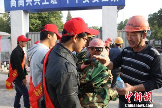 得知大学生们举行赠衣活动,盐城市区大庆路上的一施工现场,聚集了很多民工兄弟。在简单的捐献仪式后,大学生们向在场的农民工送上募集到的几百件军训服装。陈师傅迫不及待的将衣服穿在身上,开心的说:“这件军训服不大也不小,我穿着正合适。”
