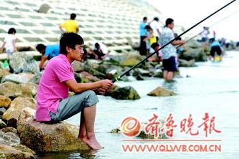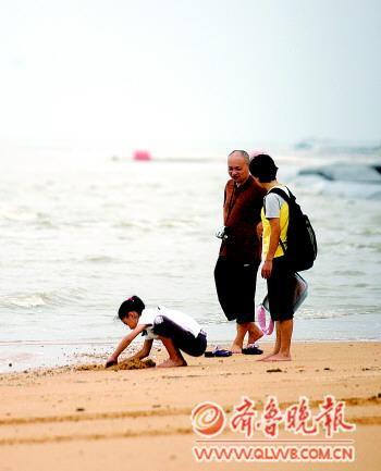 26日,在潍坊滨海经济技术开发区的海水浴场,将近20公里长防潮大堤的臂弯里,海水漫涌,浪花轻溅,千余米长的人工海滩似一勾弯月,在碧蓝的海水映衬下,显得金碧辉煌。柔软的沙滩上,不少年轻父母与孩子追逐嬉戏。