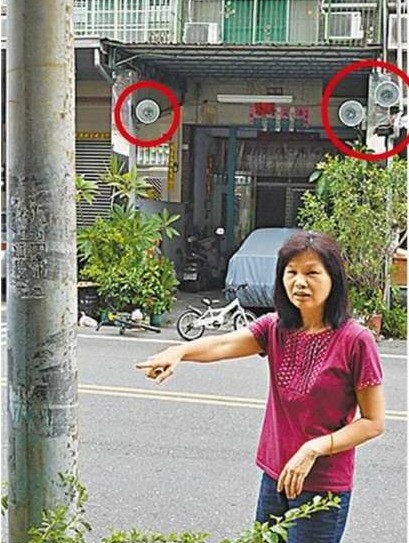 黄淑子说,石姓妇人因想迁走图中的电线杆未果,就在对面安装三盏探照灯(红圈处)扰邻。图片来源:台湾《苹果日报》网站