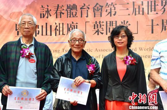 咏春一代宗师叶问之子叶准(中)受聘为香港咏春体育会永远名誉顾问。 程景伟 摄