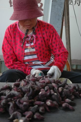 生长在水下的菱角果实,成熟时转为漂亮的暗红色。 图片来源:台湾“联合新闻网”秋末的台南官田常见菱农剥菱忙。 图片来源:台湾“联合新闻网”