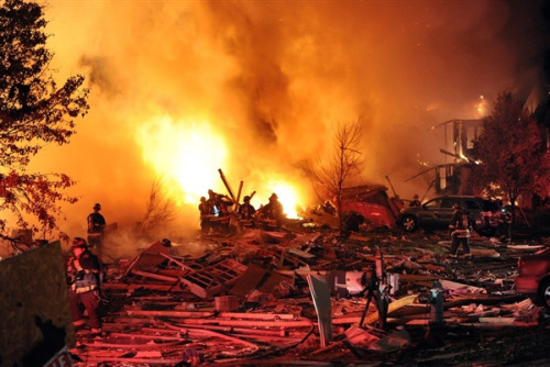 爆炸引发了强烈的大火,烧毁多座房屋。