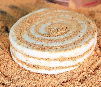 与浓稠状的麦芽糖膏不同,也跟一般看得到花生颗粒的花生糖不一样。这款花生麦芽糖,把煮过的金黄色麦芽糖浆,静置后再拉扯、混入空气,成为米白色的糖块。铺平后撒入花生粉,或玫瑰花瓣、芝麻、桂花乌龙茶叶等,再手工将麦芽糖卷细、盘旋装入铁桶。一边卷、一边让花生粉充满所有缝隙,避免麦芽糖沾黏。